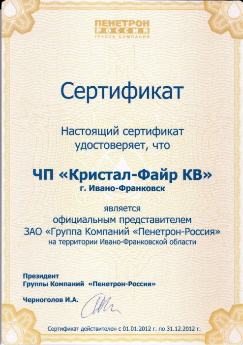 Приватне підприємство «Кристал-Файр КВ» є офіційним постачальником матеріалів проникаючої гідроізоляції системи Пенетрон на території Івано-Франківської та Київської областей. «Пенетрон» - це система матеріалів, що використовуються для проведення комплексної гідроізоляції будь-якого типу споруд та будівель, в тому числі постійно вологих та/або підтоплених.